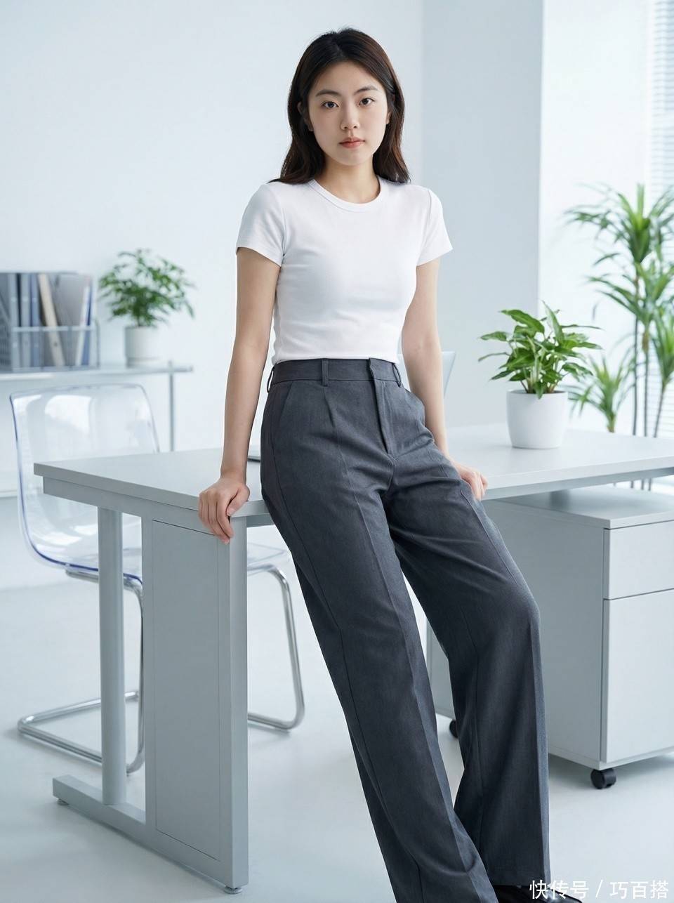 除了牛仔裤外,大家也可以尝试西装裤,用它和灰色T恤搭配时大家可以利用宽松度对比增加层次感。