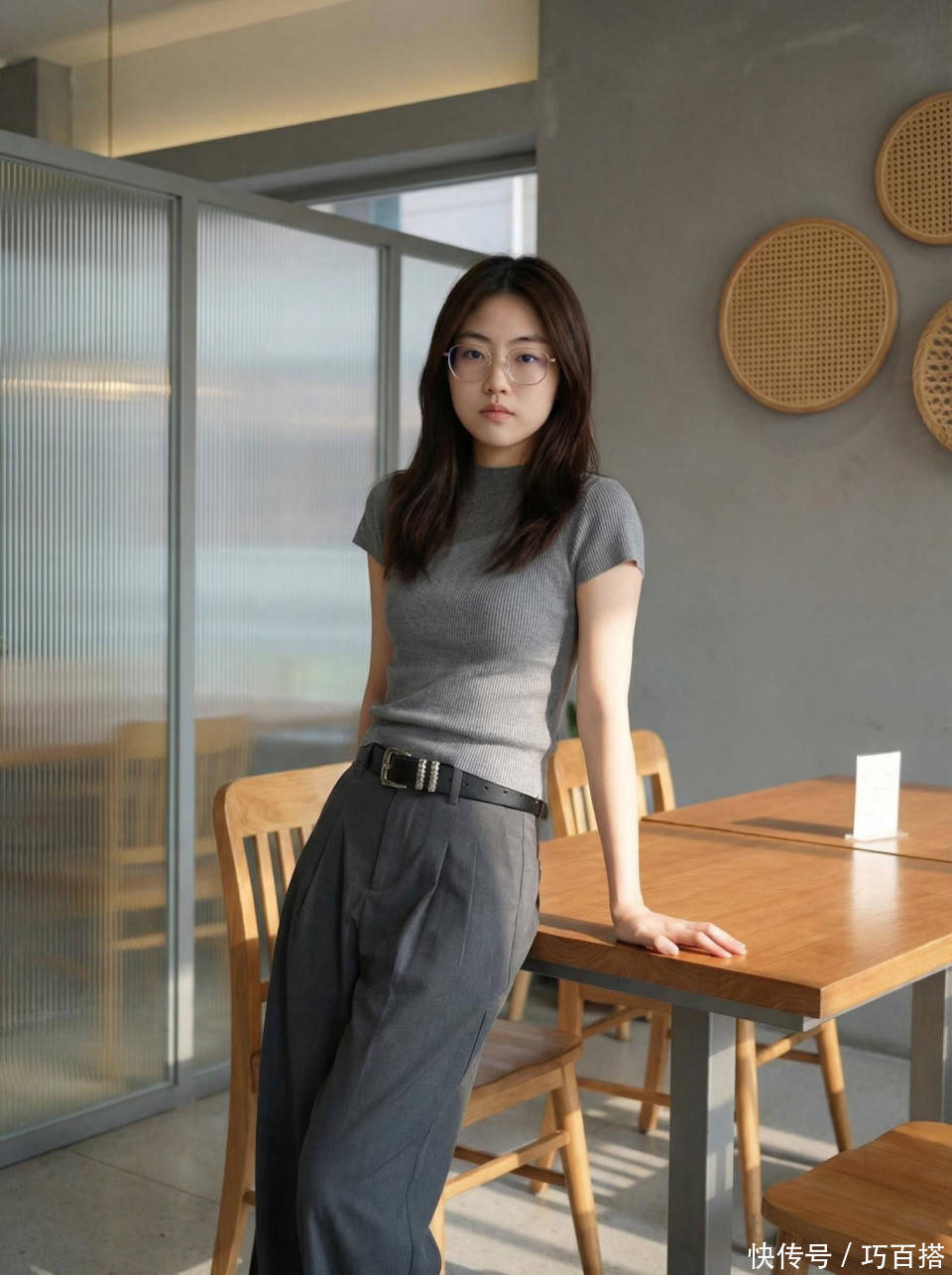 把沉稳内敛的灰色T恤穿出了轻熟性感效果,拥有天鹅颈、直角肩的姐妹别错过,但如果你是窄肩姐妹这种模式的灰色T恤别试,会显得很小气、局促。